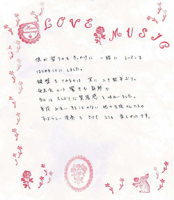 初めての発表会の思い出を、可愛い絵と素直な文章で書いてくれました。